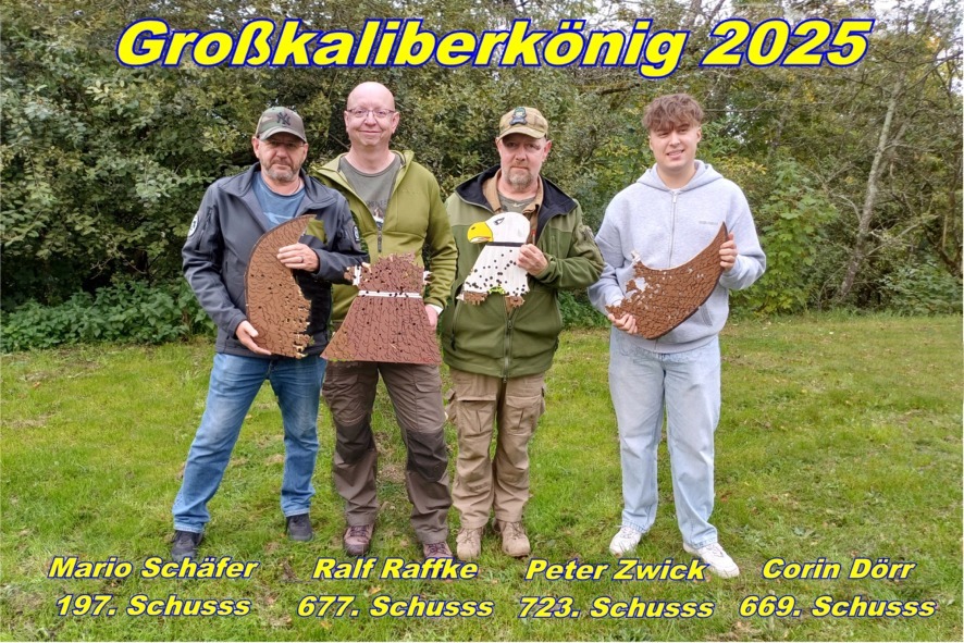Da die Schießzeit sich bereits dem Ende zuneigte erschien es unmöglich die letzte Trophäe noch ordnungsgemäß abschießen zu können. Daher entschied man jetzt direkt den König zu ermitteln. Das edle Symbol der Herrschaft war aber dermaßen geschwächt, dass alles weitere recht flott vonstattenging. Lediglich 8 weitere Schüsse waren auf den Rumpf abgegeben als Ralf Raffke durch einen Zufallstreffer den Stoß, so ist die Bezeichnung des Schwanzes bei Raubvögeln, doch noch vom Rumpf trennte. Somit war man wieder im korrekten Ablauf der Veranstaltung angekommen.